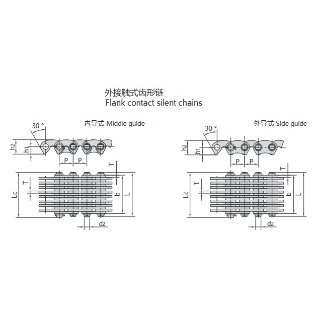 • Lanț dințat cu ochiuri exterioare:Profilul exterior drept al dinților de pe placa lanțului se îmbină cu dinții pinionului pentru o funcționare stabilă. Se remarcă prin efecte poligonale mai mari, șocuri, vibrații și zgomot sporite.