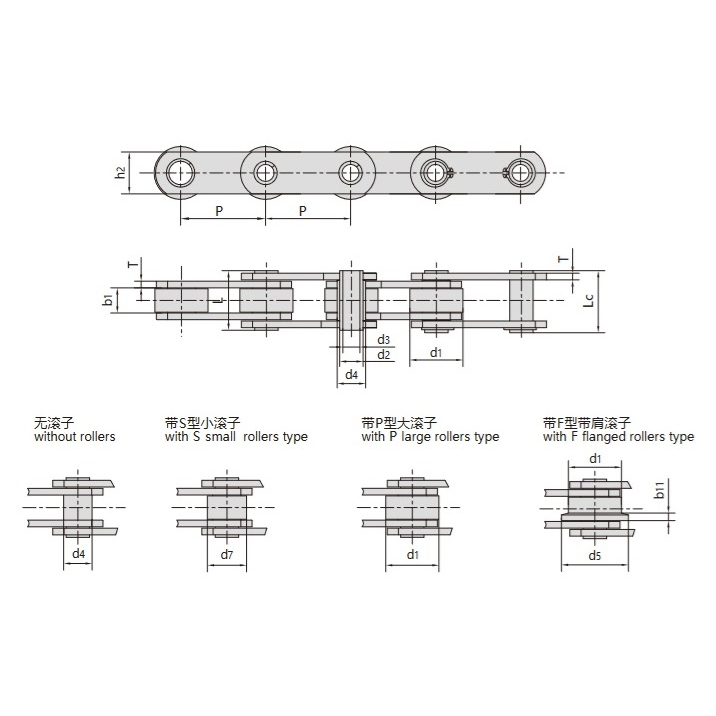 - Disponibil în varianta fără role sau echipat cu role mici de tip S, role mari de tip P și role de umăr de tip F pentru diferite nevoi de transmisie.