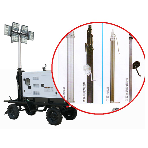 3. Sistem de ridicare: Turnul de lumină este echipat cu un cilindru telescopic cu 3 secțiuni, care poate acoperi o rază maximă de iluminare de la 35 la 55 de metri atunci când este ridicat. Cilindrii sunt controlați prin presiune pneumatică, susținând ridicarea și coborârea electrică sau manuală, cu protecție automată a presiunii aerului la coborâre. De asemenea, utilizatorii pot alege să personalizeze stâlpul de iluminat telescopic cu 4 secțiuni.