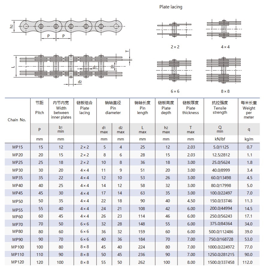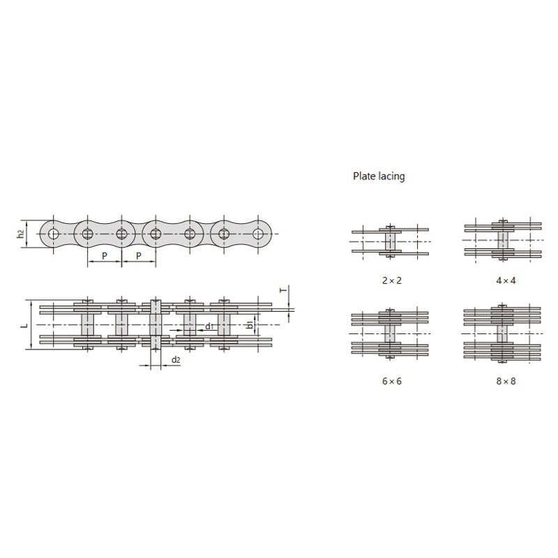- Combinație de două plăci de lanț groase și trei plăci de lanț subțiri, care asigură o forță uniformă și simetrică fără momente de încovoiere suplimentare.