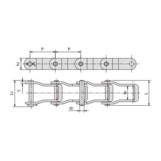 - Structură specială a lanțului realizată din verigi turnate din fontă maleabilă conectate prin știfturi din oțel, fără distincție între verigile interioare și exterioare pentru un design simplificat și performanțe robuste.